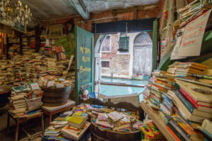 Ce que vous ne voyez pas sur cette photo, c’est la gondole remplie de livres qui trône fièrement au centre de cette librairie vénitienne. Barques, éviers, seaux, baignoires… Le propriétaire a trouvé une façon innovante d’y classer les livres qu’il vend !