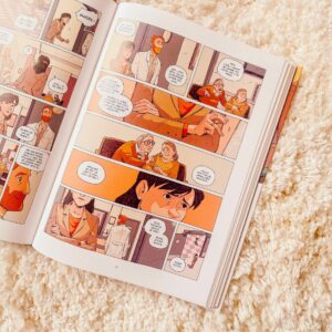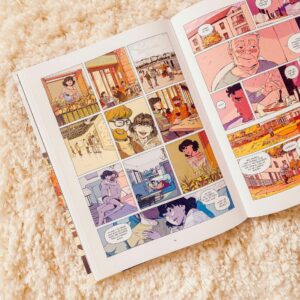 Si le coup de cœur fut d’abord visuel – l’objet livre est magnifique -, j’ai vite compris que le fond était aussi réussi que la forme. Derrière des couleurs automnales, un trait de dessin moderne et une palette pastel toute douce, Victor L. Pinel déploie un scénario au mécanisme parfait. En déplaçant les jetons de son échiquier, Mme Dubois fait progresser les aventures des différents protagonistes de la bande dessinée. Le kinésithérapeute de la résidence, sa directrice en plein divorce, un acteur au succès mondial, une jeune guitariste, une lectrice passionnée, etc. Et en se croisant, ils influencent sans le savoir la vie des autres…