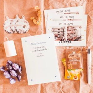 – des Goodies : thé, cartes postales, marque-page, carnet, stylo, bougie, etc…