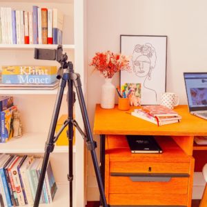 Après plusieurs essais ratés avec un appareil photo Reflex, j’ai fini par me satisfaire de mon téléphone et du rendu des photos qu’il produit. J’utilise l’Iphone 11 et je l’aime particulièrement pour son option portrait et sa lumière studio, qui détecte également les objets. Pratique quand ce qui nous intéresse, ce n’est pas de se prendre en photo soi, mais les livres 😉 Et je reste fidèle à mon téléphone pour les vidéos que je réalise.